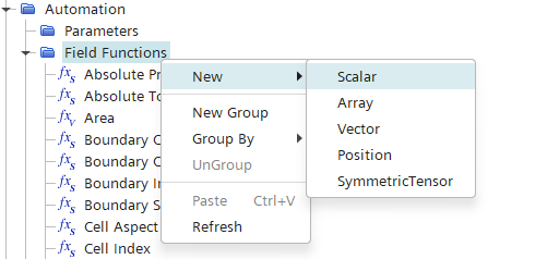 右键选择模型树节点 Field Functions ,点击弹出菜单项 New > Scalar