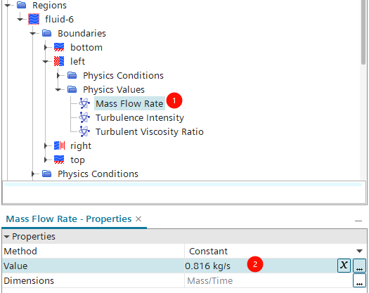 选中节点 left > Physics Values > Mass Flow Rate ,在属性窗口中指定 Value为 0.816 kg/s