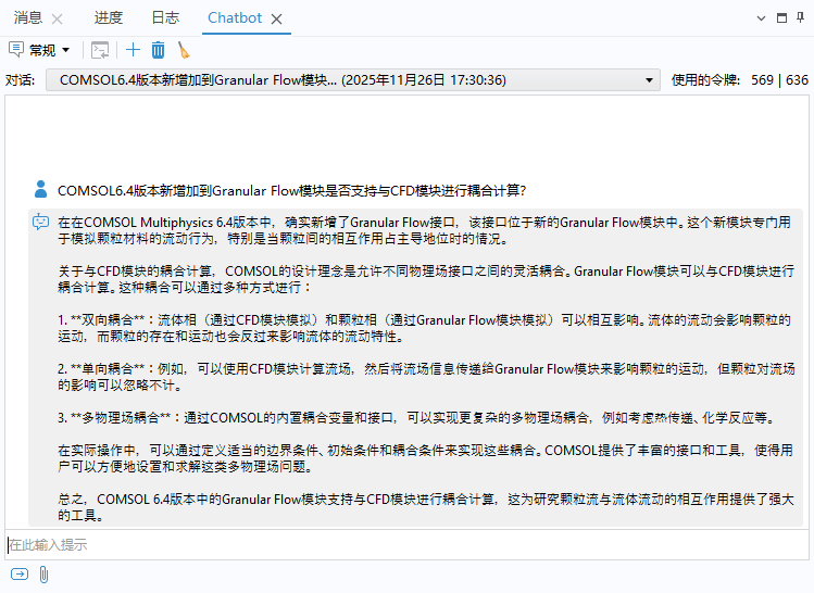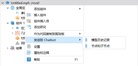 可以创建一个工程项目流程,然后在COMSOL的项目节点上点右键,可以选择发送到Chatbot > 节点和子节点菜单项打开Chatbot对话框。