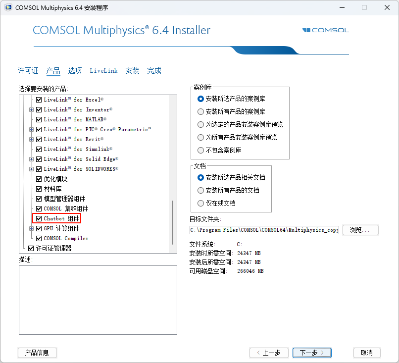 COMSOL 6.4版本的Chatbot支持使用外部API了。不过若想要使用这些功能,那么在COMSOL安装的时候需要选中Chatbot组件,如下图所示。