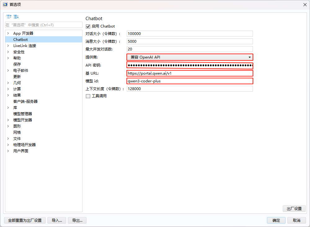 在打开的对话框中指定API信息,如下图所示,我这里随便找了个qwen3-coder的api,确定即可。这类免费的API也不少,如ZenMux网站就有免费的Gemini 3.0Pro可以使用,有兴趣的道友可以自行尝试。注意,若想要利用AI驱动软件模型参数设置,可以在此界面中激活选项工具调用。点击按钮确定后即可使用chatbot了。
