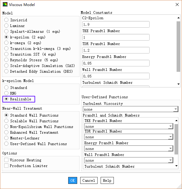 鼠标双击模型树节点Models > Viscous,弹出对话框中选择Realizable k-epsilon湍流模型