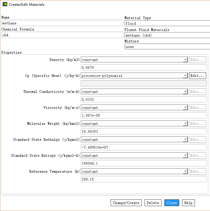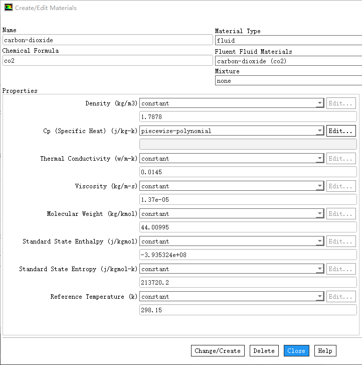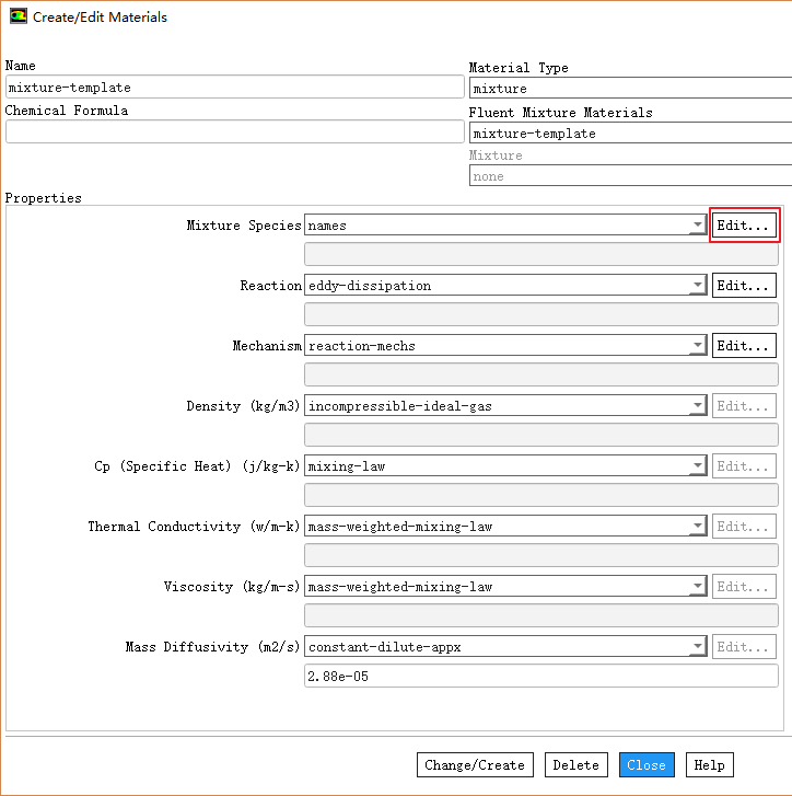 双击模型树节点Materials → Mixture → mixture-template打开混合物编辑对话框,物性参数设置如下图所示