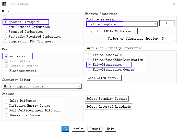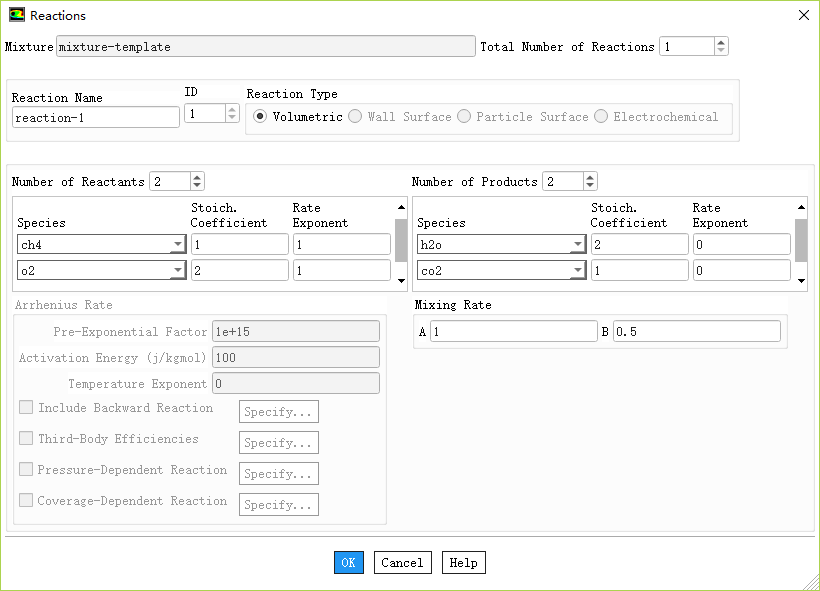 点击Mixture Species右侧的Edit…按钮编辑组分,如下图所示设置化学反应,点击OK按钮关闭对话框