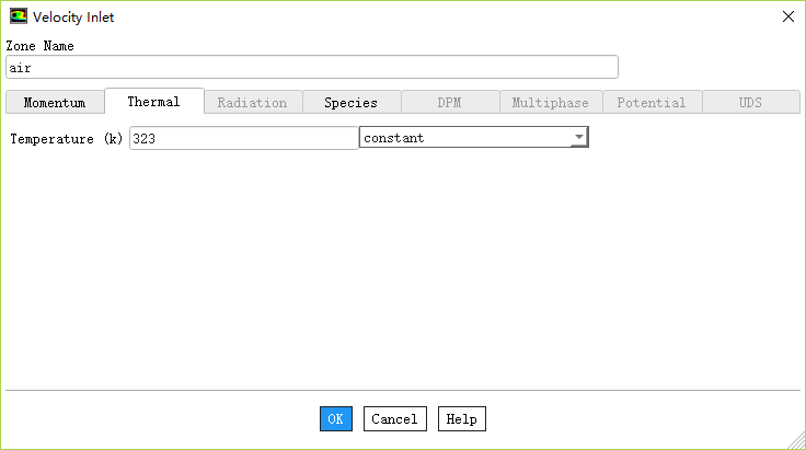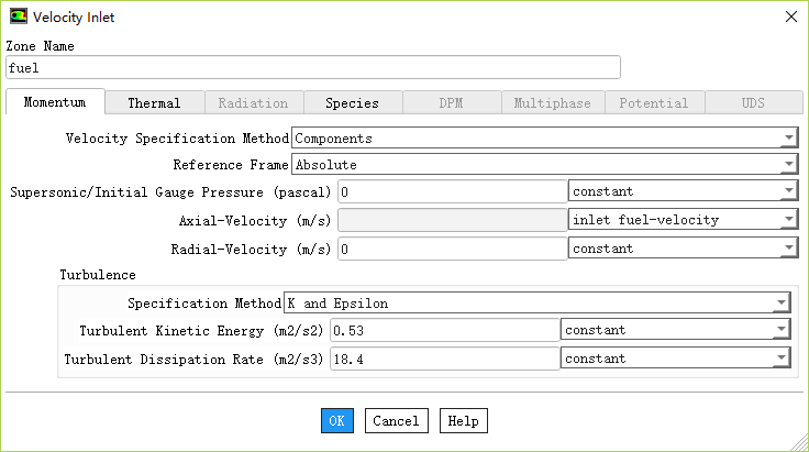 Momentum标签页设置Axial-Velocity为inlet fuel-velocity,湍流参数如下图所示设置