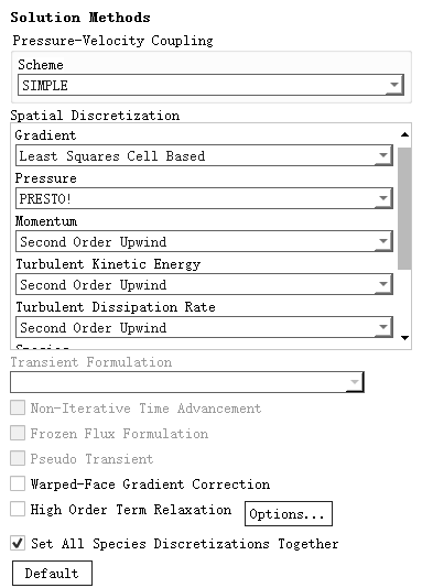 双击模型树节点Methods,右侧面板如下图所示设置Scheme为SIMPLE,其他参数如下图所示进行设置