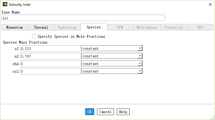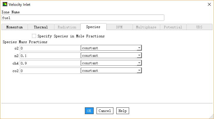 Species标签页下设置n2为0.1,设置ch4为0.9