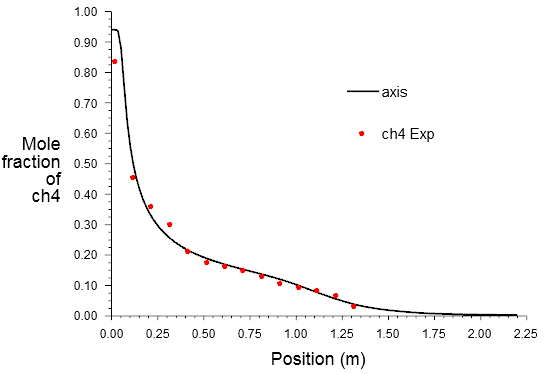 计算结果与实验值比较(轴线上CH4摩尔分数分布)