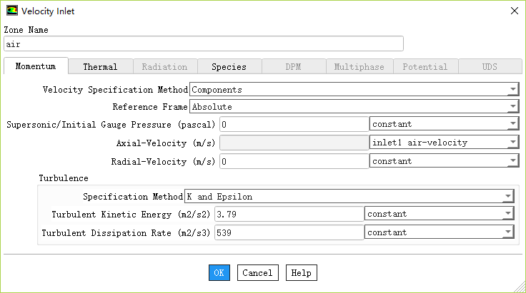 Momentum标签页设置Axial-Velocity为inlet1 air-velocity,湍流参数如下图所示设置