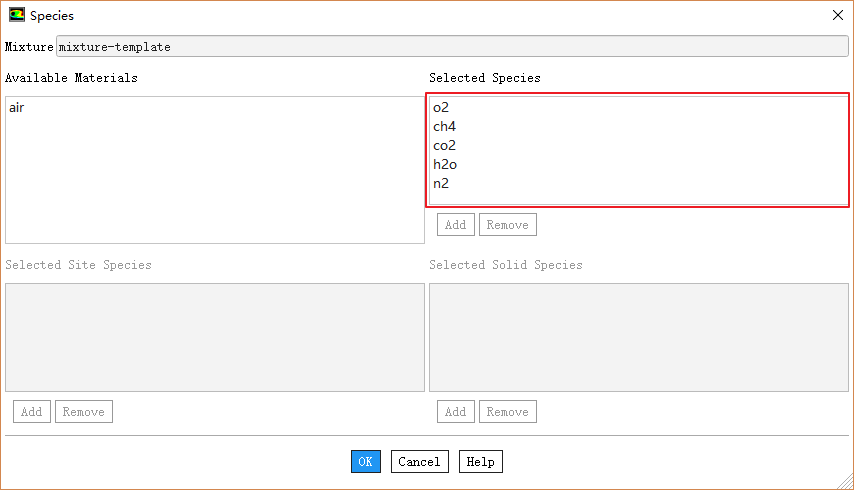 点击Mixture Species右侧的Edit…按钮编辑组分,如下图所示,点击OK按钮关闭对话框