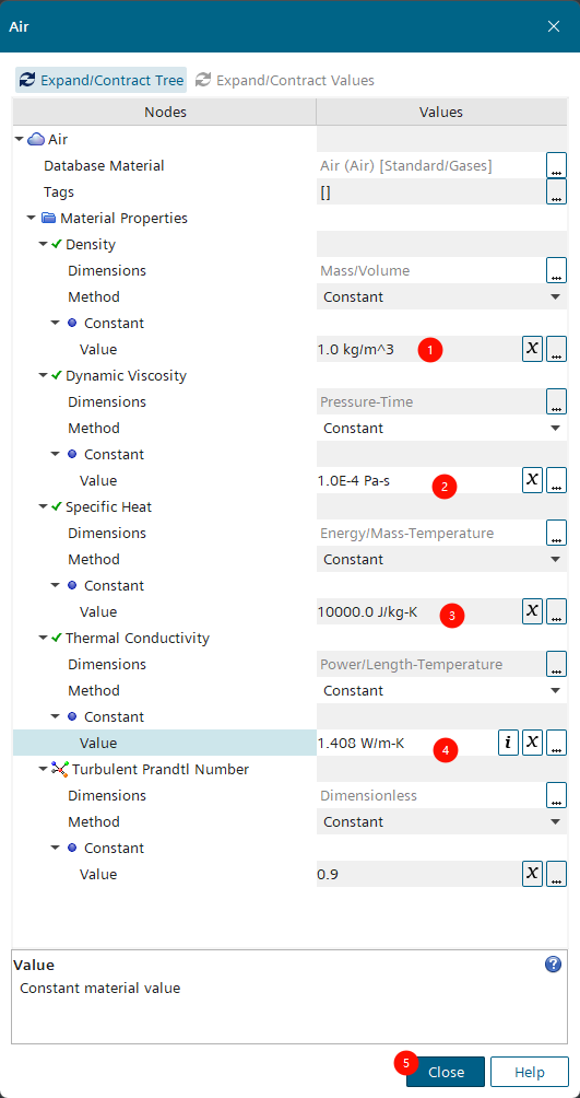 双击模型树节点Continua → Phasics 1 → Models → Gas → Air ,如下图所示设置材料介质参数