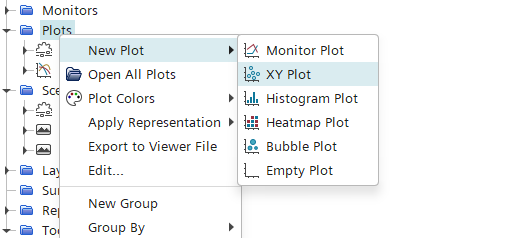 右键选择模型树节点 Plots ,点击弹出菜单项 New Poot > XY Plot 创建曲线图