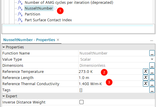 选中节点 Automation > Field Functions > NusseltNumber,指定 Reference Temperature为 273 K,指定Reference Thermal Conductivity为 1.408 W/m-K
