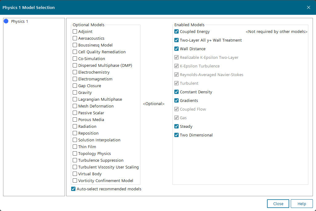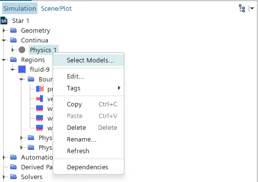 右键选择模型树节点Continua > Physics 1 ,点击弹出菜单项 Select Models… 打开模型选择对话框