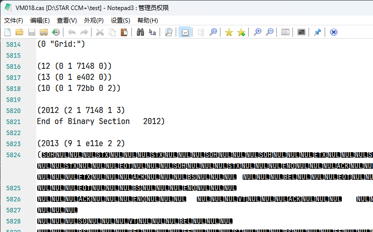 cas的cas文件。该文件可以使用ascii或二进制形式保存,但不知道从哪个版本开始,ascii形式保存的cas文件中混杂了一堆二进制乱码,就像下图中的那样,导致用户无法直接通过cas文件获取结果信息,恶心得一批。我记得早期的cas文件是完全可以用记事本读写的,读写cas结果完全可以不通过Fluent的。