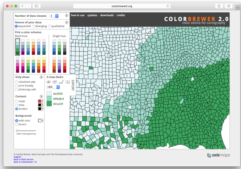 Brewer 等人的工作,堪称提升色彩研究成果可及性的典范。该研究产出大量适用于数值到色彩映射的配色方案。而对可视化实践者而言,Brewer 工作的真正价值在于:其提供了一个网页界面(见图 4),操作简洁直观,便于用户选取整套配色方案;选定后,网站即刻输出可直接导入任意程序、API 或网页界面的色彩数值。该网站的建设与持续维护工作,其投入远超任何单一学术出版物;而它对可视化领域所产生的实际影响,亦远非任何出版物所能比拟。这一色彩资源库成效卓著,尽管其最初设计目标专为制图学(cartography)服务,如今“Color Brewer”网站已成为各类可视化工作的标准参考。