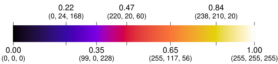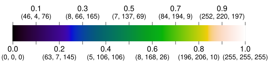 图 8. 一种感知线性色图,除黑体辐射色图中的红色与黄色外,还融入蓝色与紫色色相。所提供的颜色可在 CIELAB 色彩空间中插值。