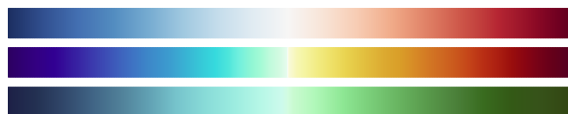 一种替代单调亮度色图的方案是发散型色图(diverging color map),即一种双端色图:两端分别采用不同色相的颜色,并在中间汇合于一种明亮的中性色。传统上,发散型色图专为呈现具有中间特殊意义数值的标量数据而设计(例如,高程数据中的海平面,或温度数据中的冰点)。