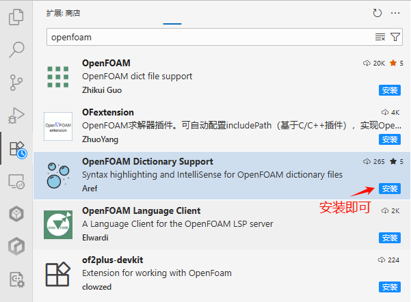 直接在扩展程序面板中搜索 OpenFOAM 即可找到。