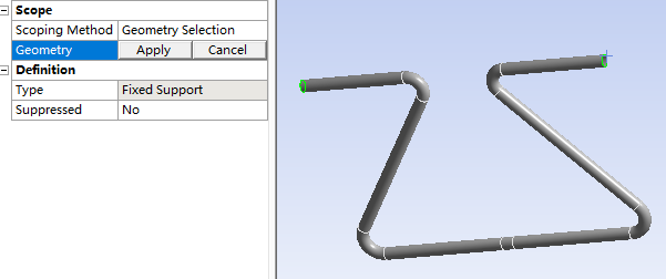 切换到边选择模式,在图形窗口中选择U型管进出口两侧的4个圆边,如下图所示,点击属性窗口中的Apply按钮添加约束