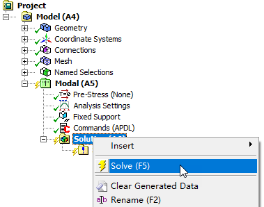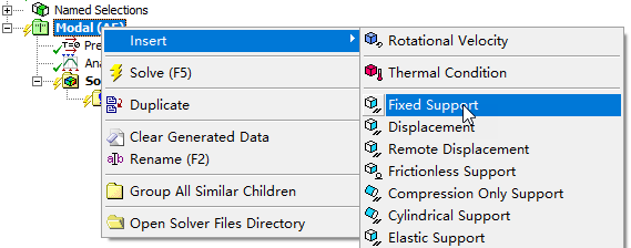 右键选择模型树节点Modal,选择右键菜单Insert → Fixed Support