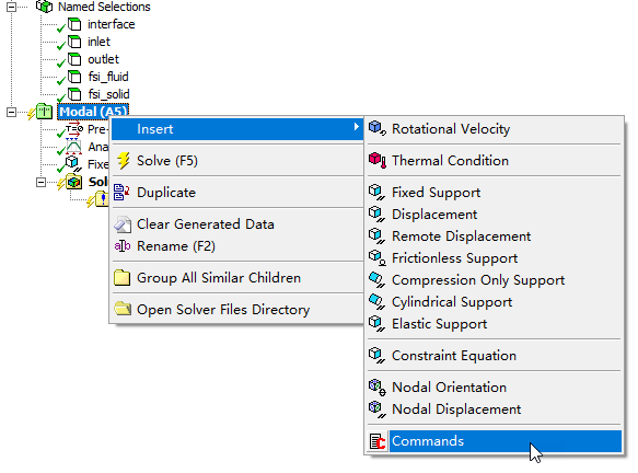 鼠标右键选择模型树节点Model > Geometry > Part > fluid,选择弹出菜单Insert → Commands,弹出命令输入面板