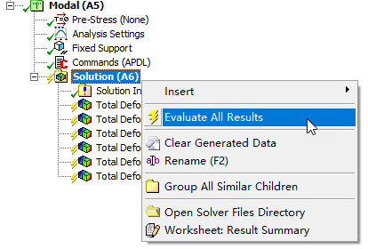 右键选择模型树节点Solution,选择菜单Evaluate All Results更新结果