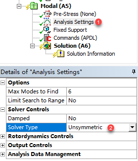 选中模型树节点Analysis Settings,属性窗口中设置Solver Type为Unsymmetric