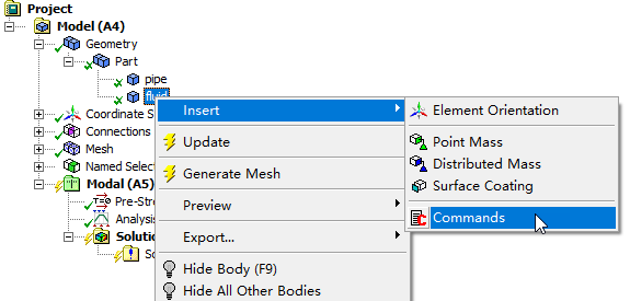 鼠标右键选择模型树节点Modal,选择弹出菜单Insert → Commands插入命令