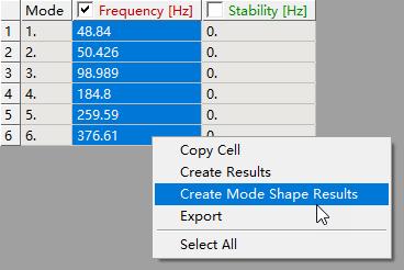 计算完毕后,可在结果列表中查看前6阶频率。选择所有的Frequency,点击鼠标右键,选择菜单Create Mode Shape Results