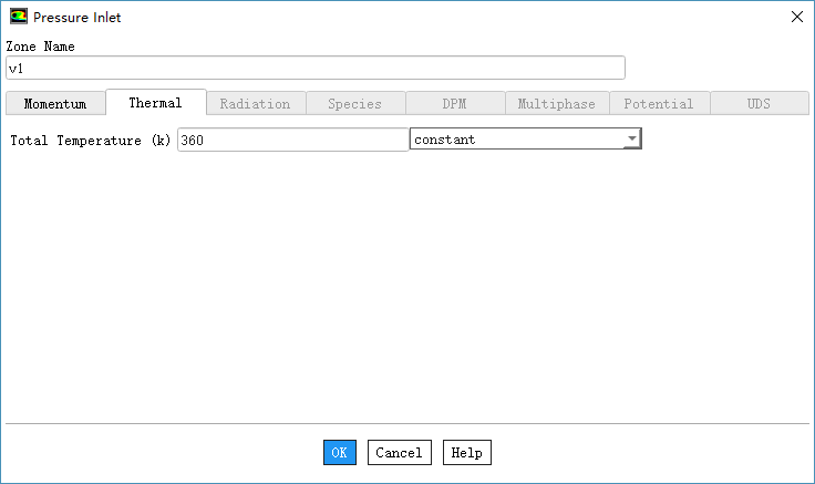 Momentum标签页设置Gauge Total Pressure为36000 Pa,湍流参数如下图所示进行设置
