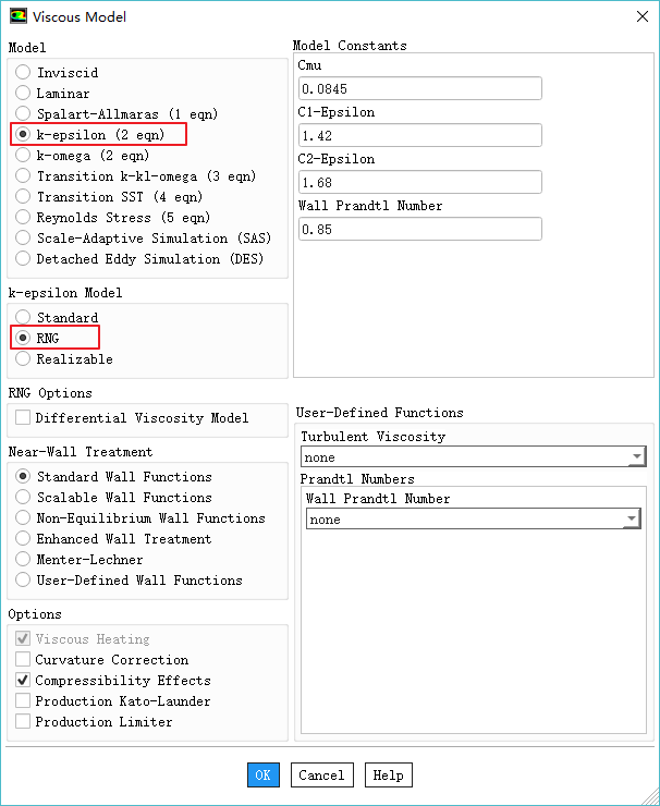 鼠标双击模型树节点Models > Viscous,打开的设置对话框中选择选项k-epsilon及RNG以激活湍流模型