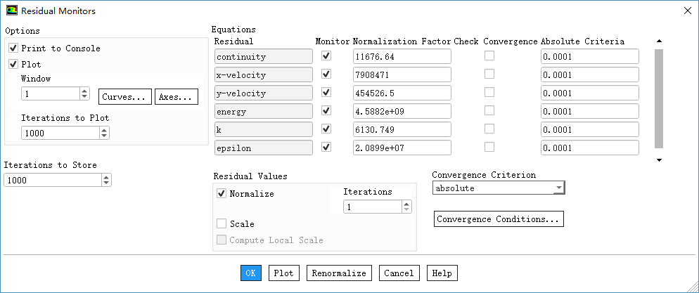 双击模型树节点Monitors > Residual,弹出设置对话框,如下图所示进行参数设置