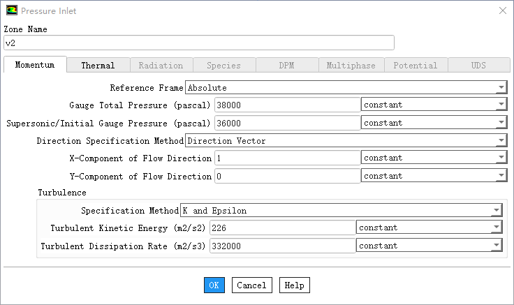 Momentum标签页设置Gauge Total Pressure为38000 Pa,湍流参数如下图所示进行设置