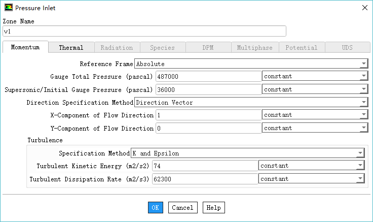 Momentum标签页设置Gauge Total Pressure为487000 Pa,设置Supersonic/Initial Gauge Pressure为36000 Pa,湍流参数如下图所示进行设置
