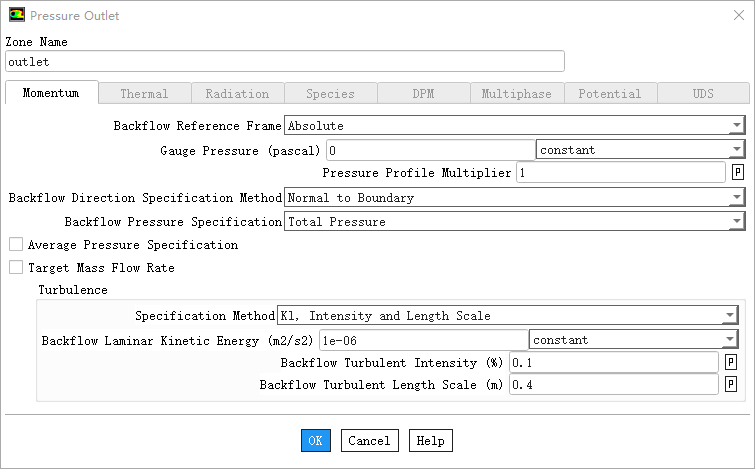 鼠标双击模型树节点Boundary Conditions > outlet弹出设置对话框