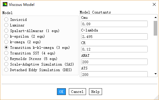 鼠标双击模型树节点Models > Viscous,弹出对话框中选择选项Transition k-kl-omega激活转捩模型