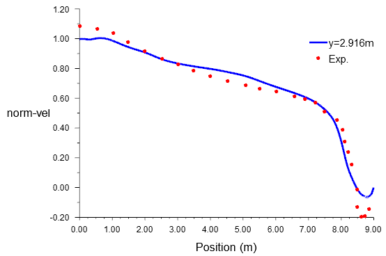 查看x=2.916m位置norm-vel分布,并与实验数据进行比较,如下图所示