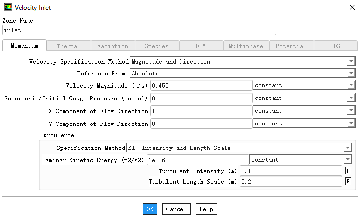 鼠标双击模型树节点Boundary Conditions > inlet弹出设置对话框