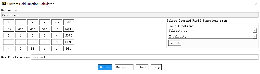 右键选择模型树节点Custom Field Functions,点击弹出菜单项New,在弹出对话框中定义变量norm-vel = Vx/0.455,如下图所示