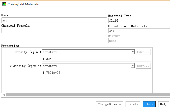 鼠标双击模型树节点Materials > Fluid > air弹出材料属性设置对话框