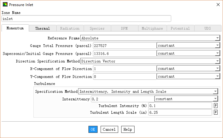 鼠标双击模型树节点Boundary Conditions > inlet,弹出设置对话框,如下图所示