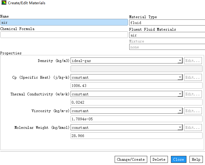 鼠标双击模型树节点Materials > Fluid > air弹出材料属性编辑对话框
