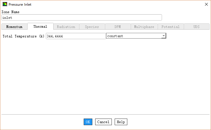 切换至Thermal标签页,设置Total Temperature为344.4 K,如下图所示