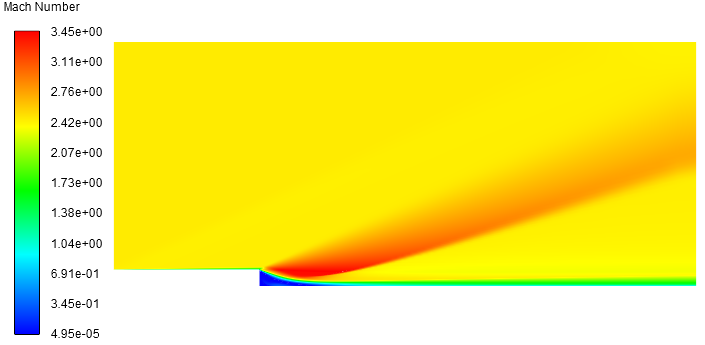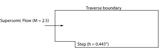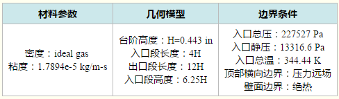 本案例计算的模型如下图所示。入口流速2.5马赫的超声速流体流过后向台阶,计算流场的突扩、自由剪切层、循环区域以及斜激波。流动雷诺数处于过渡范围。