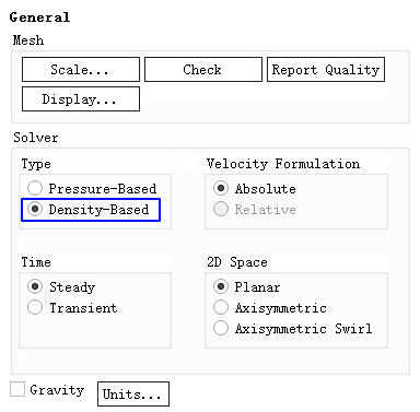 双击模型树节点General,右侧面板激活选项Density-Based采用密度基求解器