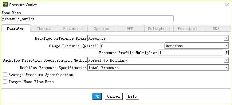 双击模型树节点Boundary Conditions > pressure-outlet,弹出对话框中设置如下图所示湍流条件