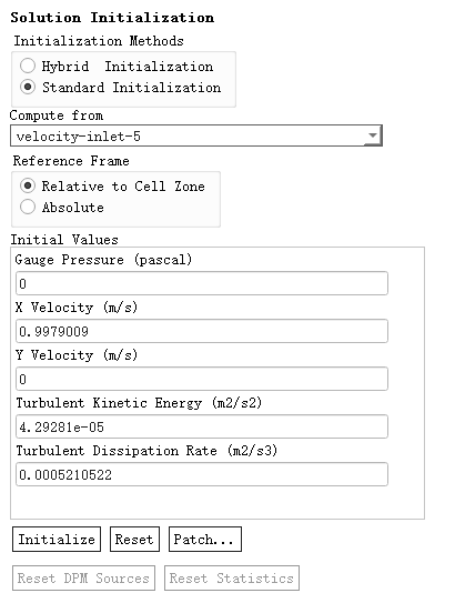 双击模型树节点Initialization,右侧面板选择Standard Initialization,并选择Compute from为velocity-inlet-5
