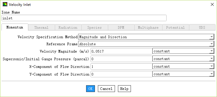 双击模型树节点Boundary Conditions > inlet,弹出对话框中设置入口速度为0.0517 m/s,并如下图所示