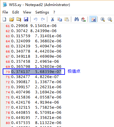 将结果数据输出到文本文件,打开文件查看极值点位置,如下图所示,可看出极值点坐标为0.374137,此位置即流动再附着位置。